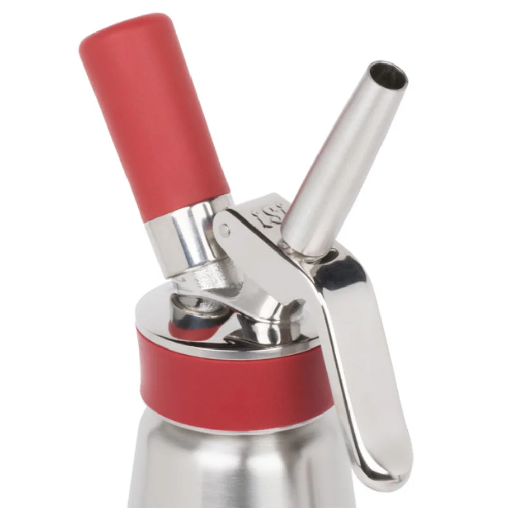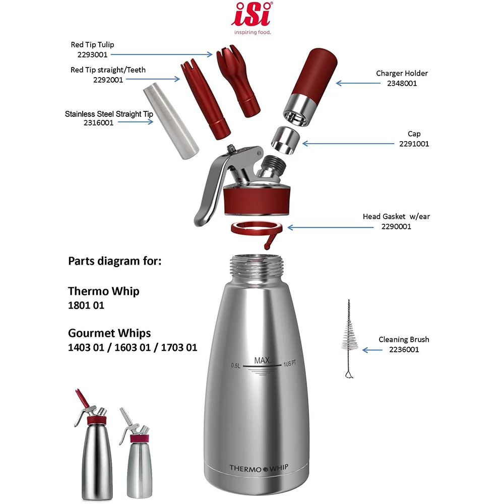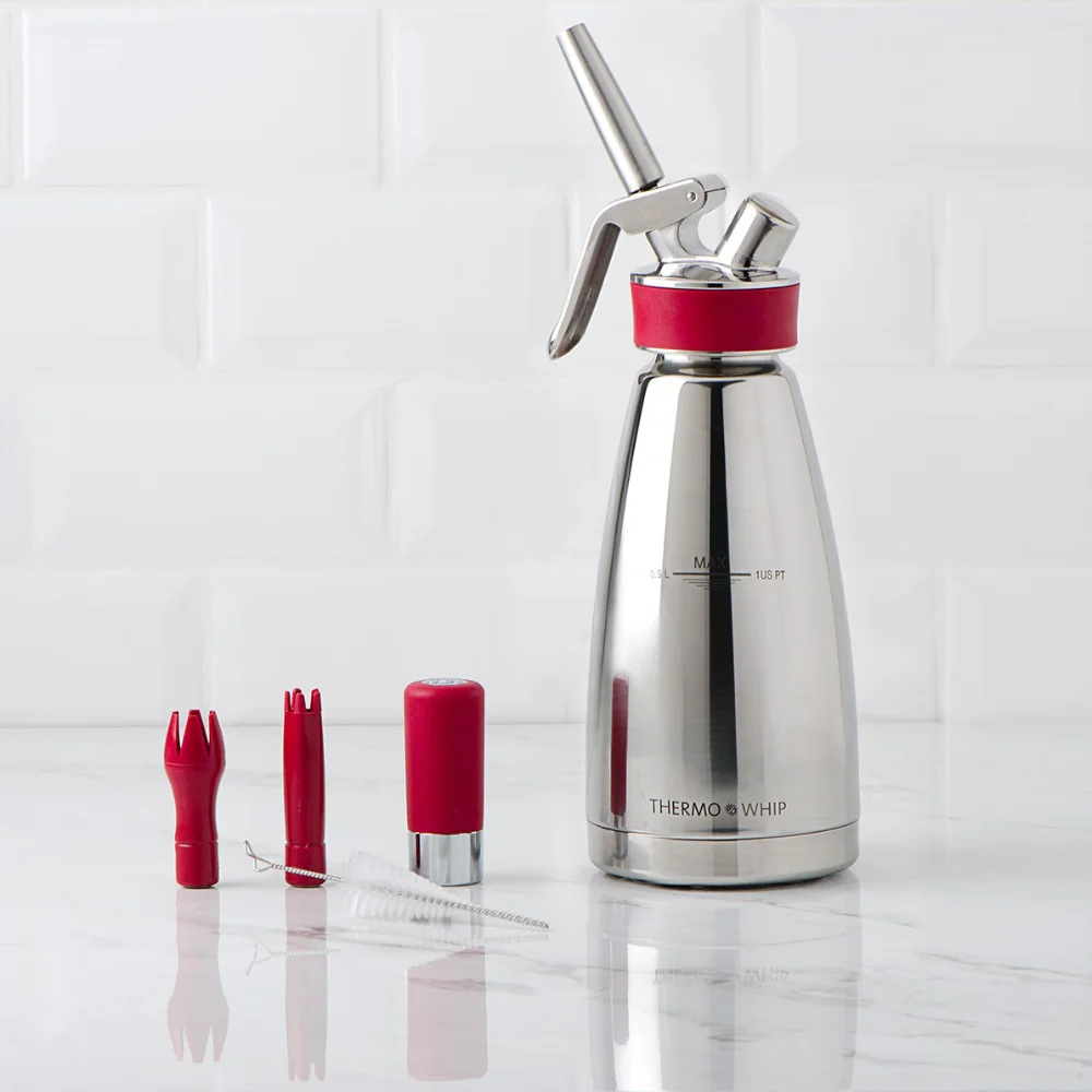 Double walled stainless steel vacuum bottle with maximum insulating performance: Keeps cool up to 8 hours – keeps warm up to 3 hours. For the preparation of whipped cream, warm and cold sauces, and light and frothy Espumas, soups, and desserts. Dishwasher safe. Metal head with protective silicone grip and fixed stainless steel valve. Closed and sealed system – fits HACCP requirements.