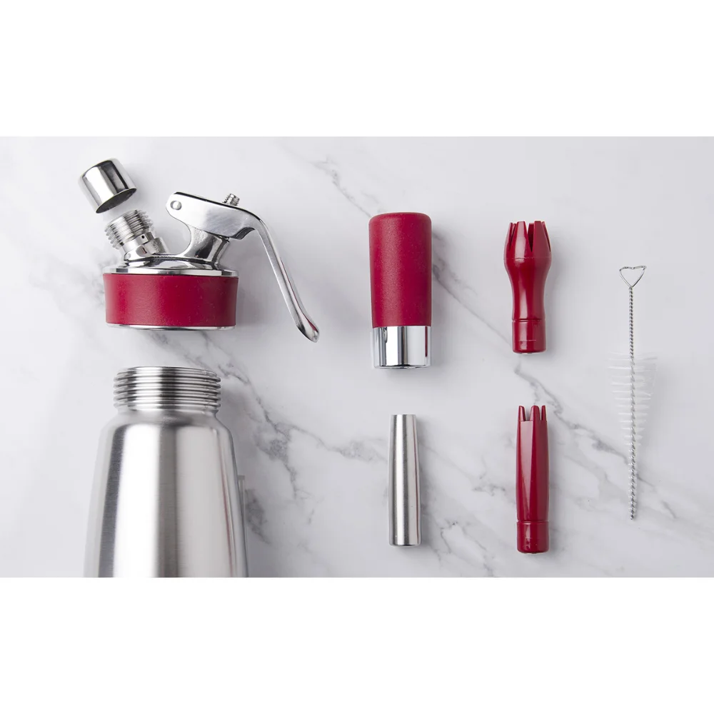 The versatile tool for cooking & catering convenience. For the preparation of light and fluffy espumas, finger food, warm and cold sauces and whipped soups, as well as whipped cream and desserts. Stainless steel bottle and head – designed for the professional use.
