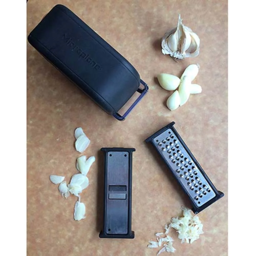 - Grates several cloves of garlic at once into tiny bits retaining all their natural oils
