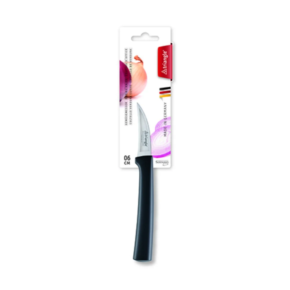 Universal paring knife with curved blade for peeling and cutting fruit and vegetables.