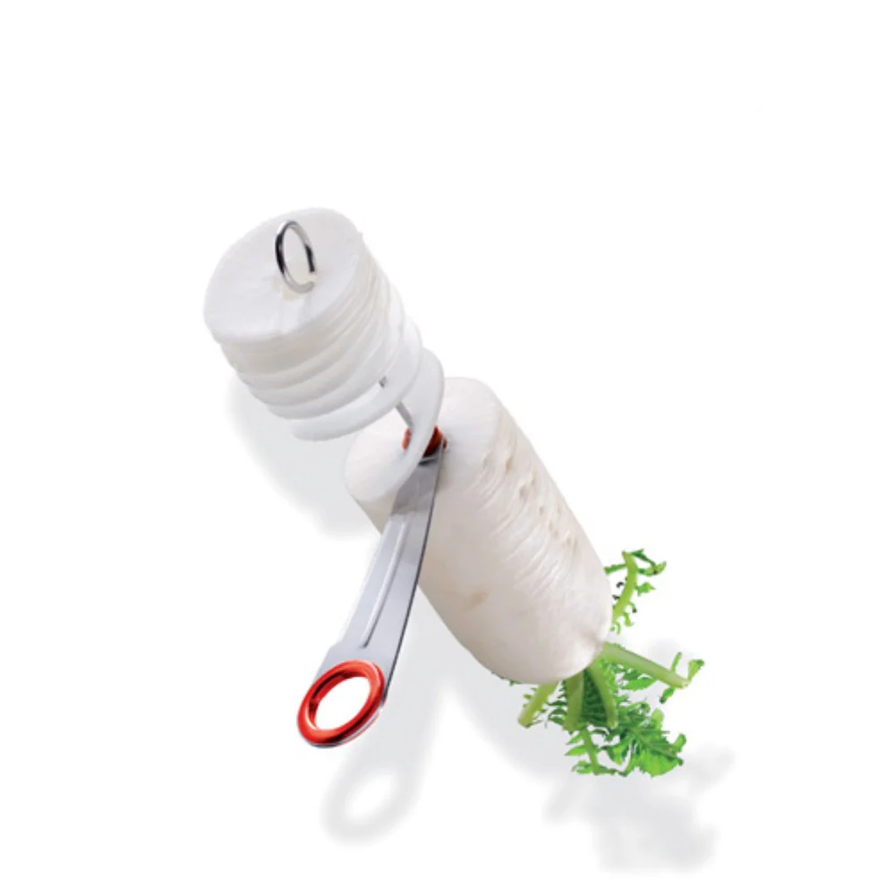 The Triangle Radish Curler is indispensable to serve a Bavarian radish Radi” in style. It cuts large white radish or Daikon into a thin endless spiral that is salted and served with pretzels, white sausage and sweet mustard. Or simply with a cold beer.