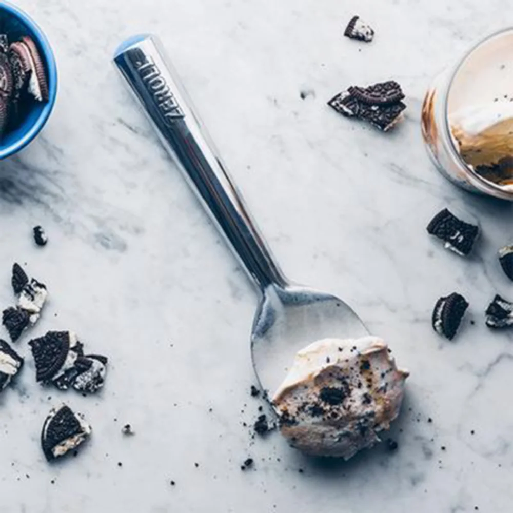 Heat-conductive liquid in the handle takes advantage of the natural warmth of the hand to facilitate smooth scooping and serving.